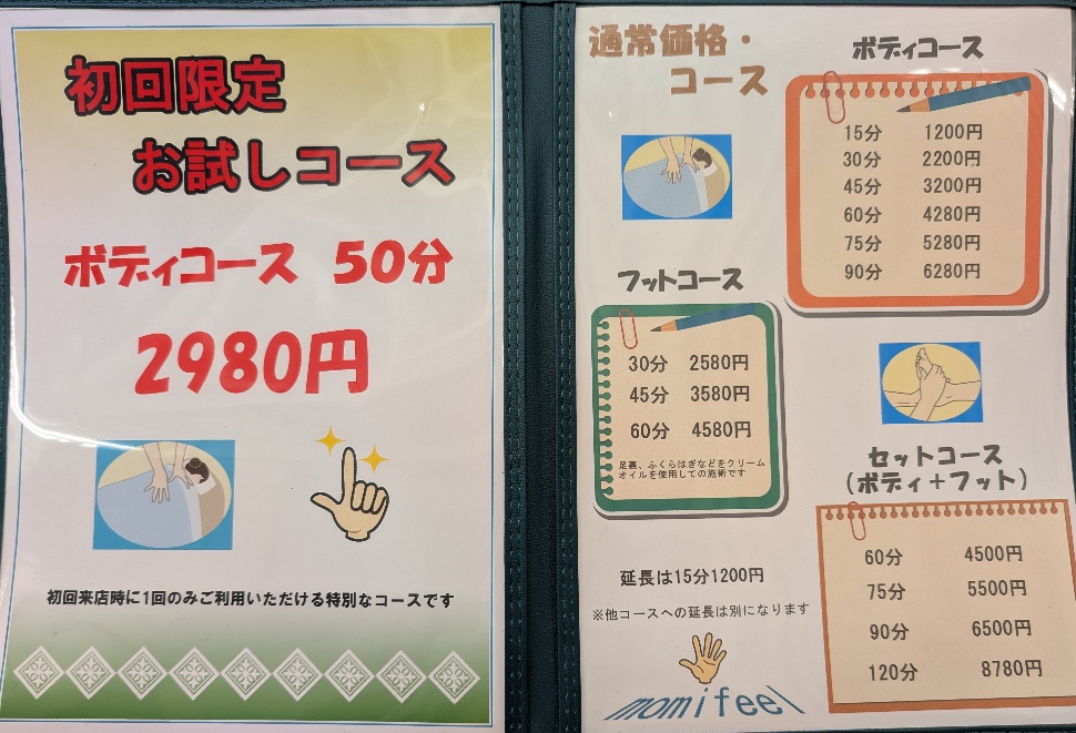 ボディコース 通常価格 コース15分 1200円 30分 2200円45分 3200円 60分 4280円 75分 5280円 90分 6280円LINE友だちに登録していただきますとポイントをためていただけたり限定クーポン、限定コースなどお得にご利用していただける場合もございます。